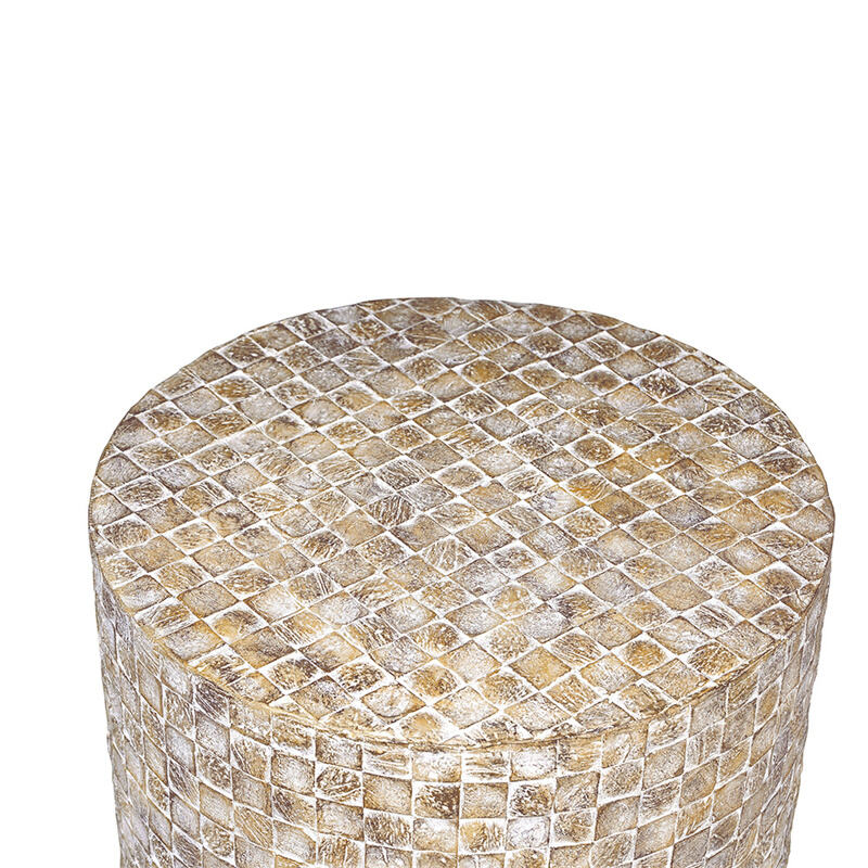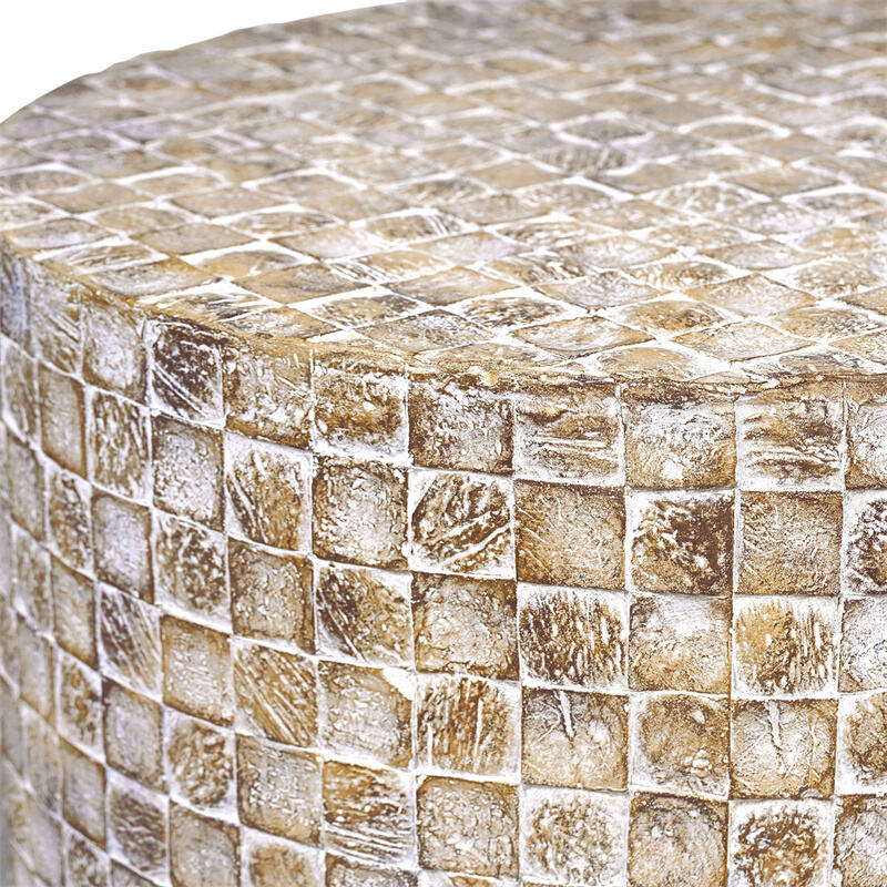 Round end table made of MGO which is high temperature resistance, degradable, and new environment-friendly materials that come from nature,then arranged into a mosaic pattern and natural coconut shells . The standout shape of this table breaks up tired spaces, making it the perfect perch for books of art and stylish décor. The distressed look adds texture and interest to your space. Variations from natural processes and materials mean each piece is as unique as your style. Pair with a comfy sectional and loveseat for an airy space to enjoy the little moments every day.