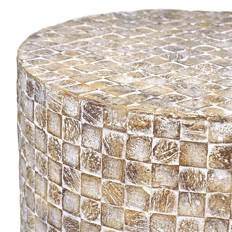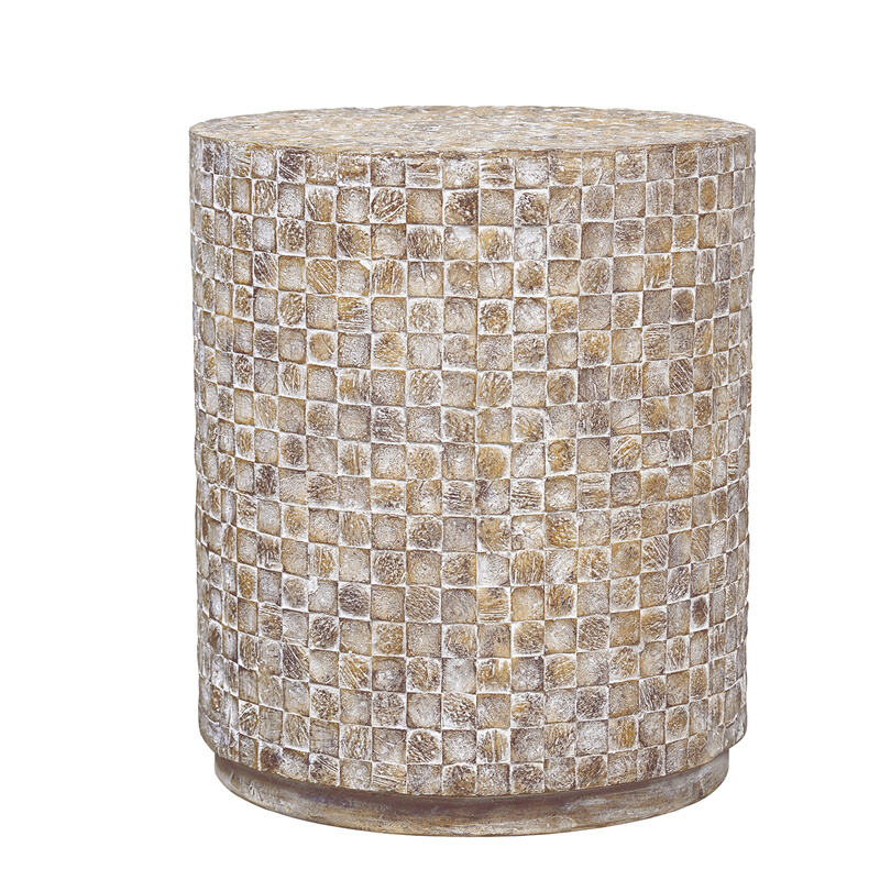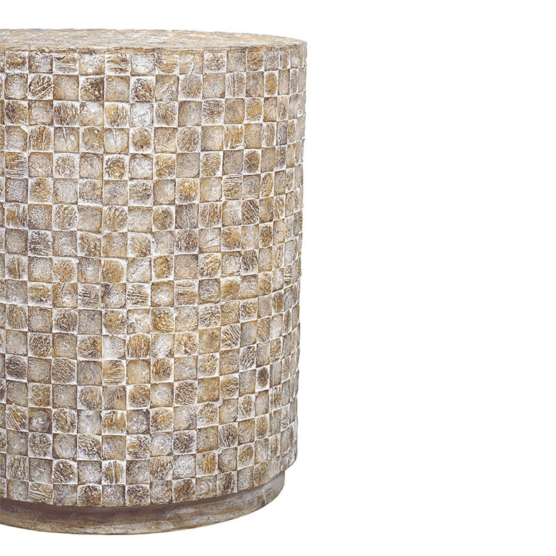 Round end table made of MGO which is high temperature resistance, degradable, and new environment-friendly materials that come from nature,then arranged into a mosaic pattern and natural coconut shells . The standout shape of this table breaks up tired spaces, making it the perfect perch for books of art and stylish décor. The distressed look adds texture and interest to your space. Variations from natural processes and materials mean each piece is as unique as your style. Pair with a comfy sectional and loveseat for an airy space to enjoy the little moments every day.